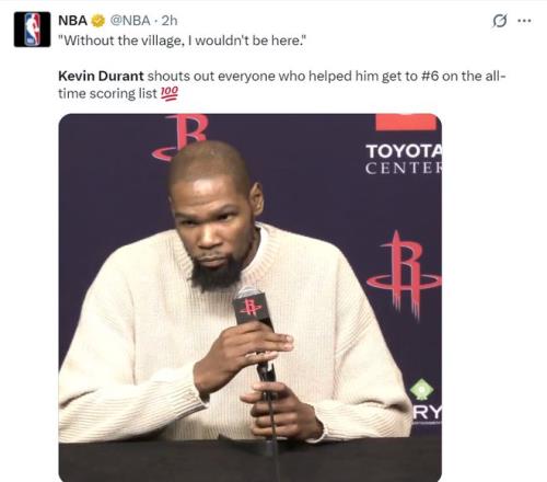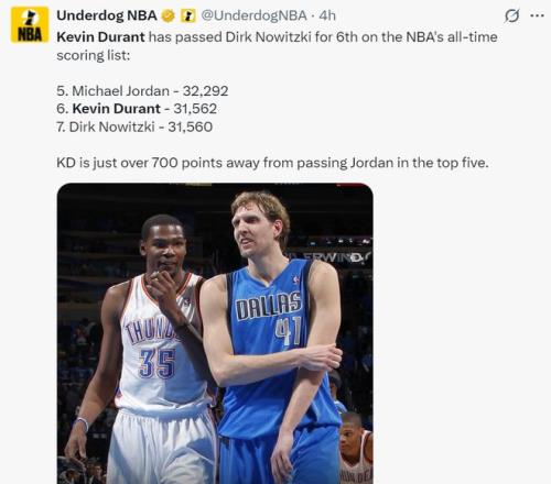 賽后杜蘭特談到自己的得分升至歷史第六:這意義重大,德克是我敬仰的榜樣,也是我曾對抗過的對手。我很榮幸能與這些偉大的球員并肩在得分榜單上。