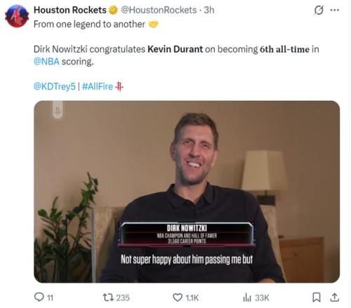 諾天王還專程為KD錄制了慶祝視頻,德克說道:杜蘭特是籃球歷史上最純粹、最流暢的得分手之一。