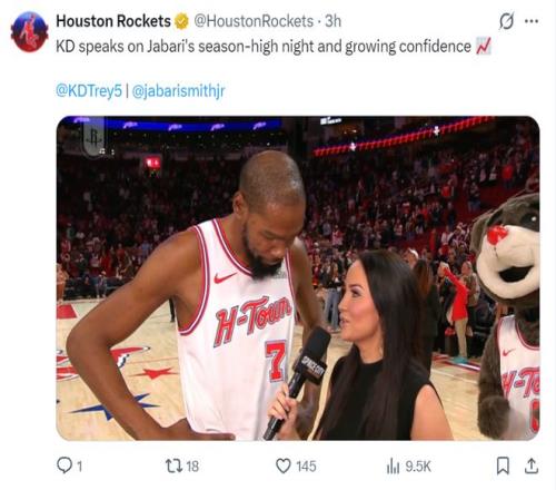 杜蘭特是賽后這樣說道:德克一直以來都是我的偶像,我們打過不少精彩的比賽,我曾視他為我的偶像,能與這樣的傳奇并列簡直不可思議,而且我現在的總得分跟邁克爾-喬丹緊挨著,這感覺太瘋狂了。